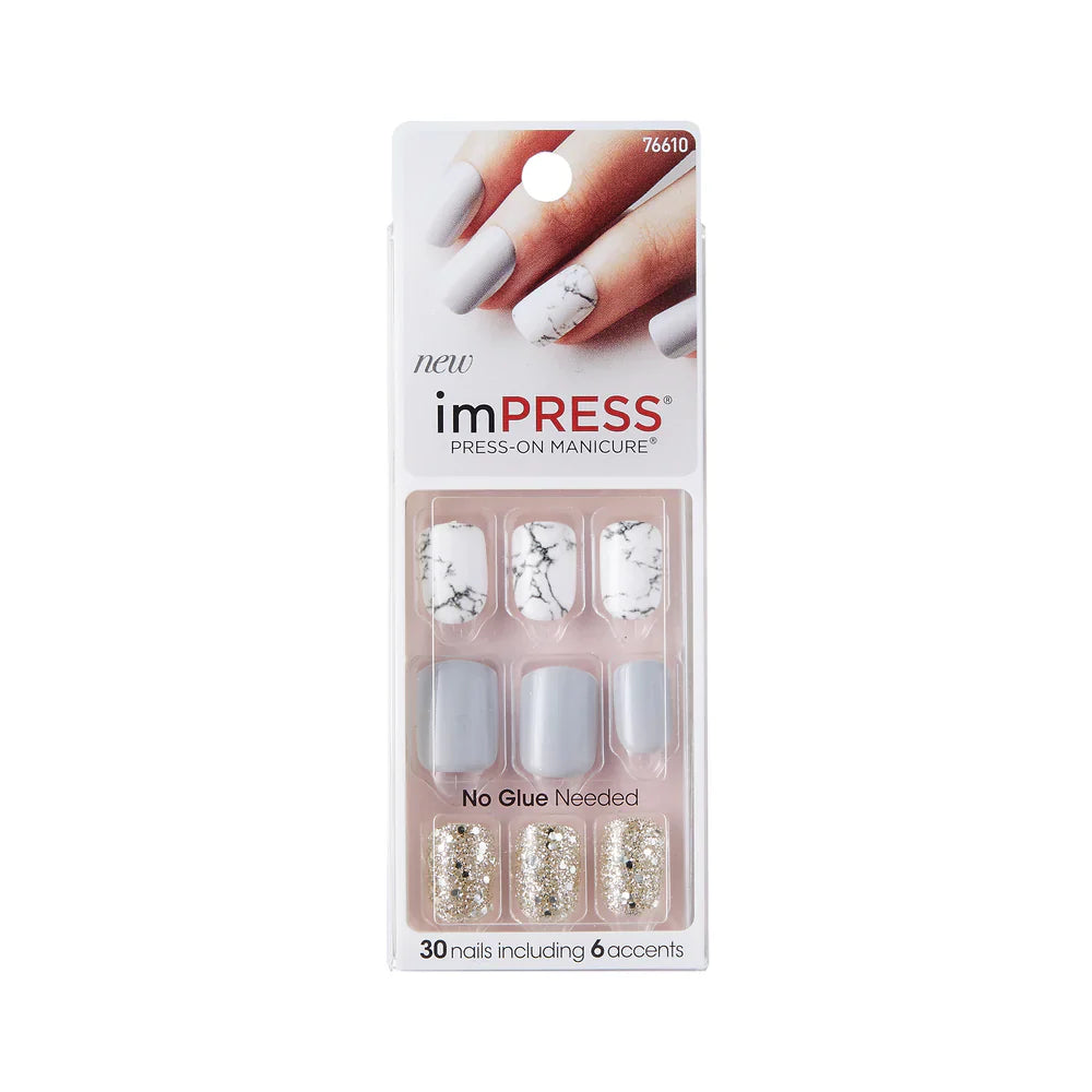 With New ULTRA-FIT Design, imPRESS ready-to-wear Press-on Manicure is Slimmer yet Stronger. The one-step gel mani in minutes is now better than ever! Style Yeah Boy is right on trend with white marble nails and gold glitter accents. Just press on & go!